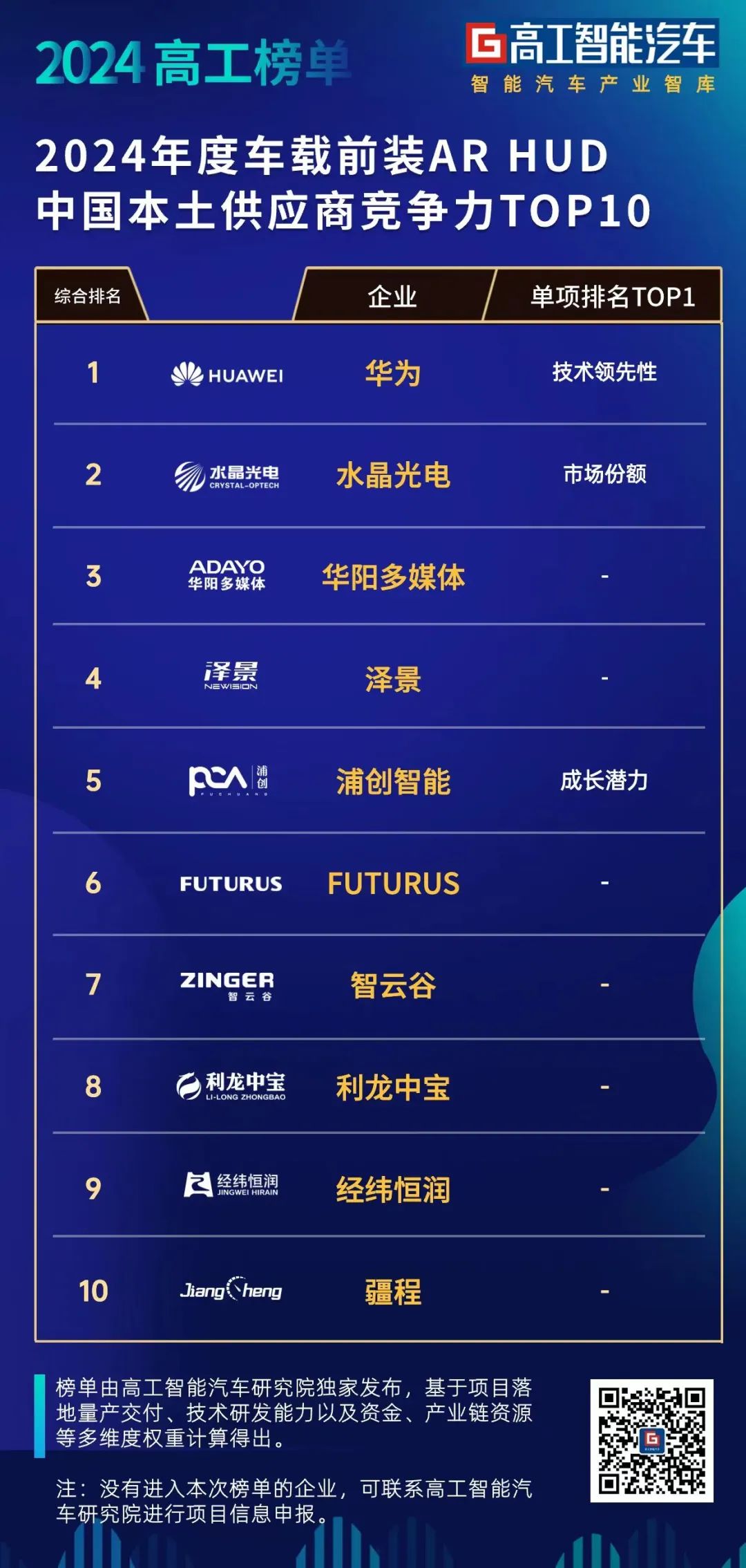 近日,高工智能汽车研究院基于企业市场表现(合作车企的数量和交付规模)、AR-HUD技术及产品竞争力以及经营规模等指标,正式发布《2024年度前装AR-HUD本土供应商竞争力TOP10》。