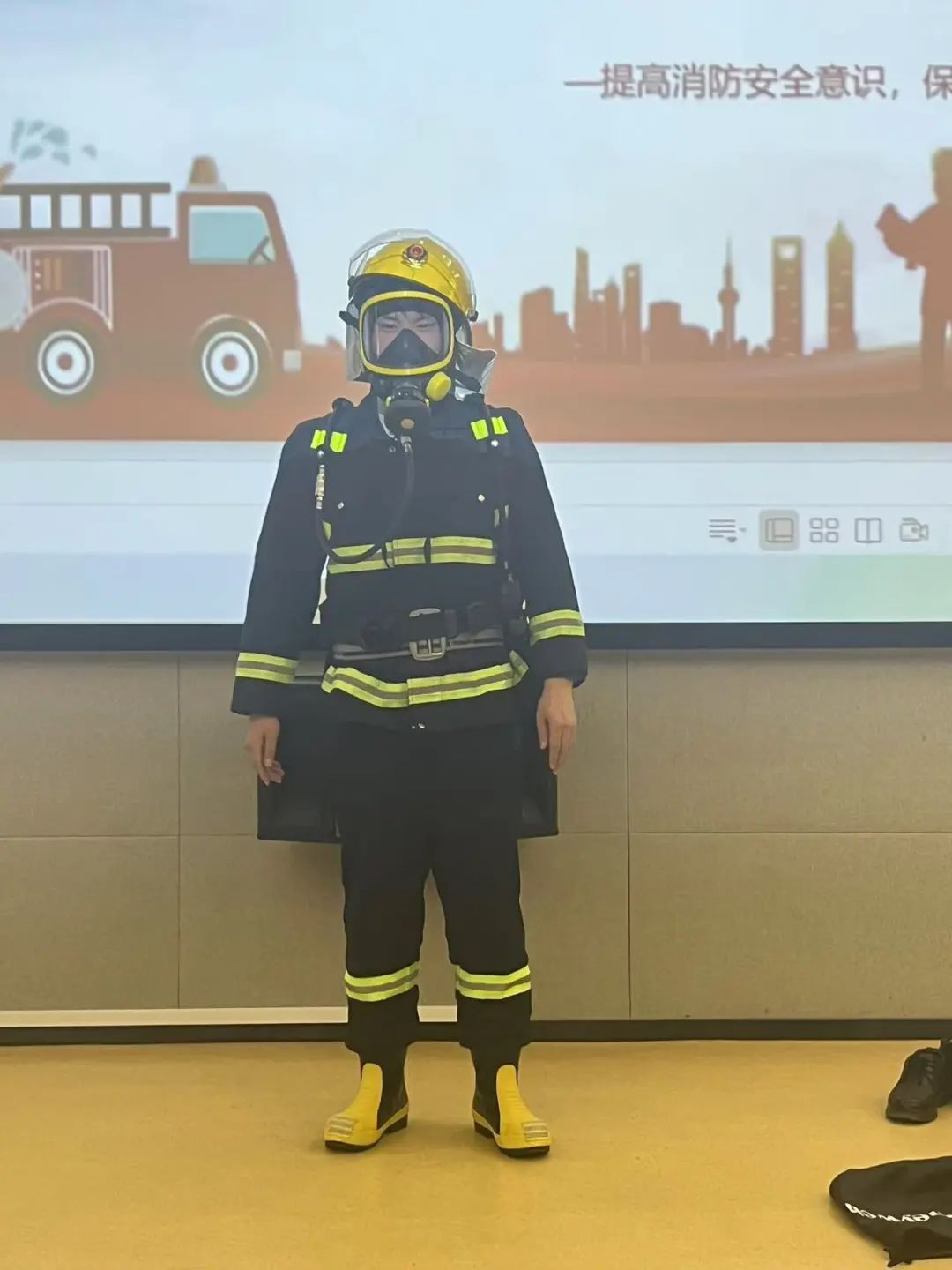 义务消防员庞炜冰对消防服和空气呼吸器穿戴进行讲解和示范。示范过程中大家目不转睛生怕错过任何一个细节,结束后踊跃提出疑问,与讲解员进行深入交流。