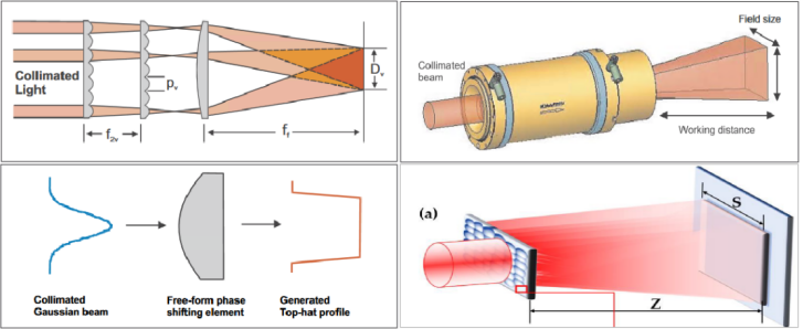 图1 左上图阵列MLA模组匀化方案[1]; 右上图单DOE实现方形匀化和整形[1]; 左下图自由曲面实现光束整形[1]; 右下图随机MLA整形方案[2]