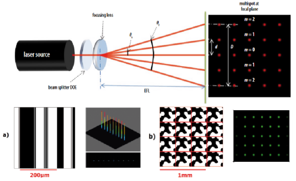 图4 上图为DOE阵列分束的光路示意图[5]; 左下图为一维光栅1*9分束,右下图为二维光栅5*5分束[7]。